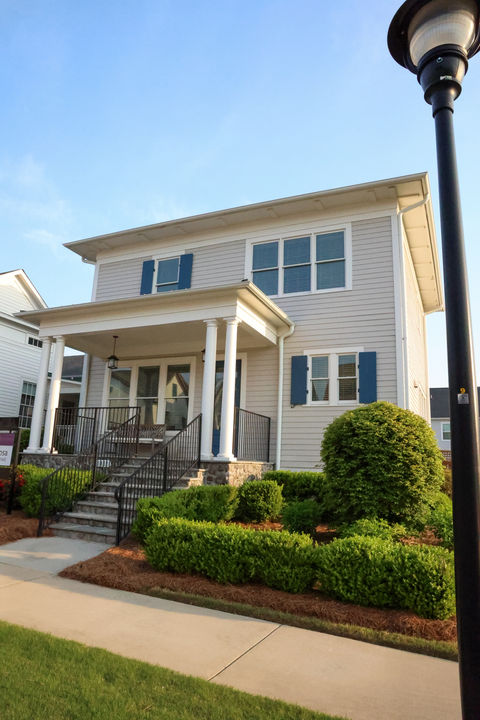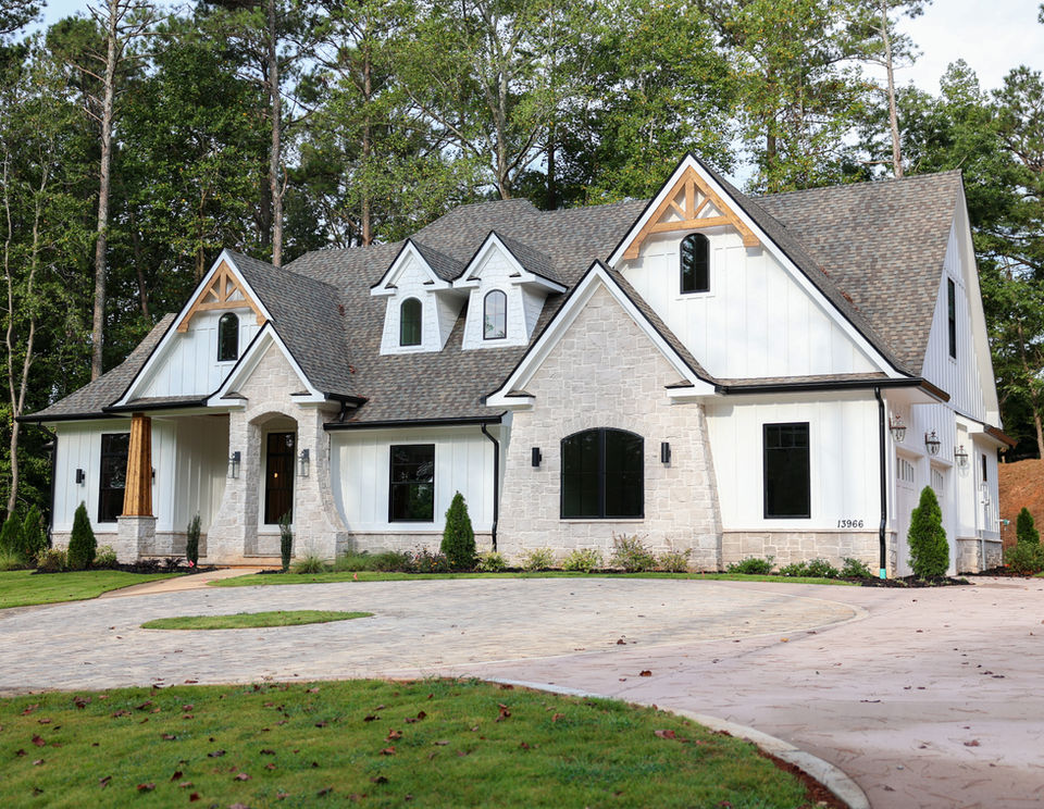 This home is a modern farmhouse-style home featuring a mix of light stone and white board-and-batten siding, accented by black-framed windows and natural wood beams. Its steep roof and dormer windows add a touch of classic charm to its contemporary design.
